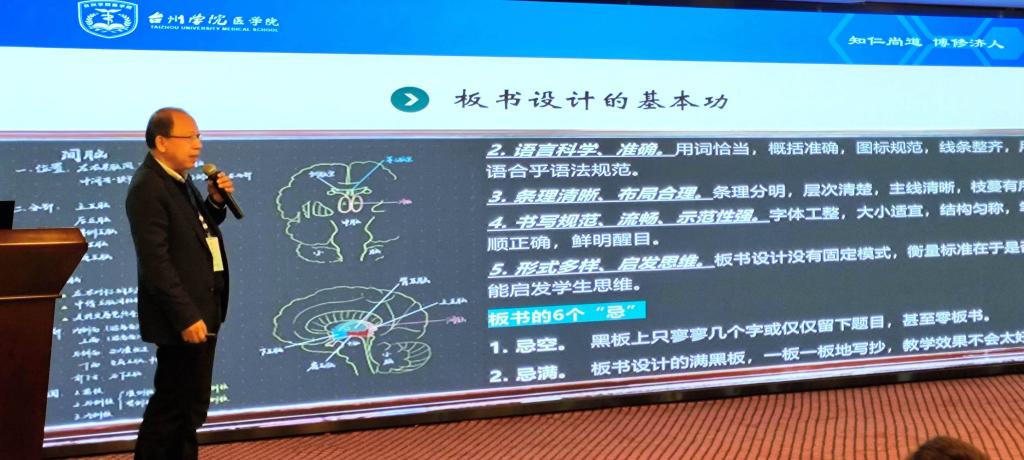 吴仲敏督导以“如何提升医院青年教师教学基本功”为主题,从解读教材、备课、运用教学语言、板书设计、现代教育技术、组织教学、教学评价、教育科学研究共八个方面阐述了教学基本功的内涵,并结合自身的教学经验举例说明每一项教学基本功的训练要点。吴老师精美的人体解剖图板书令现场的青年医师赞叹不已。