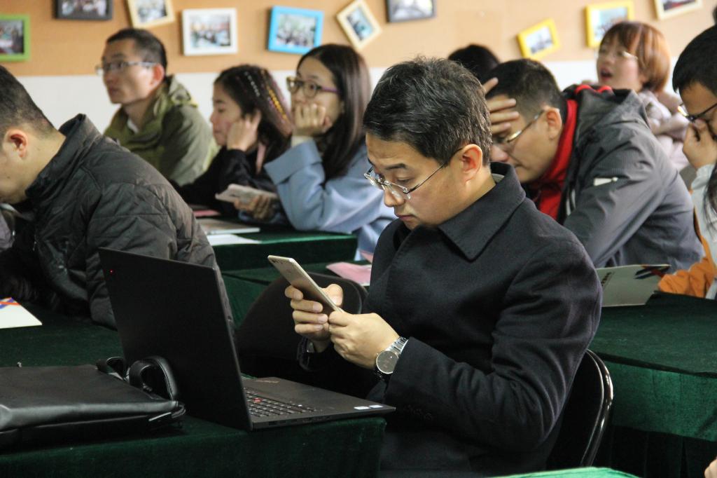 公司区域主管金满库先归纳了课堂教学中的常见痛点,接着为老师们介绍了蓝墨云班课四大功能特征:一是互动即时反馈;二是资源推送提醒和记录;三是过程性激励与过程性考核评价;四是实时教学大数据和学情分析。同时,他邀请老师们一起使用手机在电脑屏幕上进行了操作与体验。之后,他又讲解了基于蓝墨云班课的新型教学模式,以及移动教学大数据的分析与研究。
