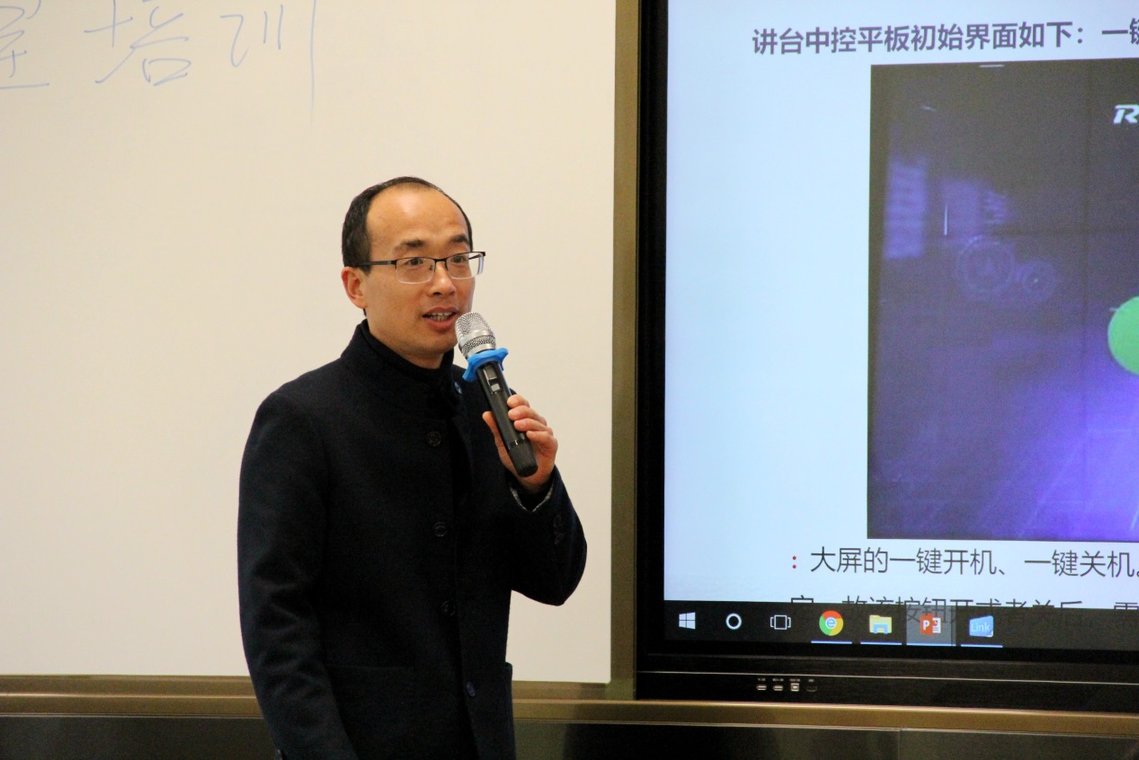 信息中心赵仁刚老师及相关技术人员依照课前、课中、课后的课堂教学顺序为老师们详细讲解了智慧教室的主要功能和使用方法。他为大家演示了课前物联控制器的操作,讲解了大屏幕、控制平板等硬件设备的使用指南,最后,他示范了如何简单快捷地进行课堂录播。在座老师纷纷拿起自己的手机或笔记本电脑,尝试投影讨论屏幕、下载录播视频等功能。