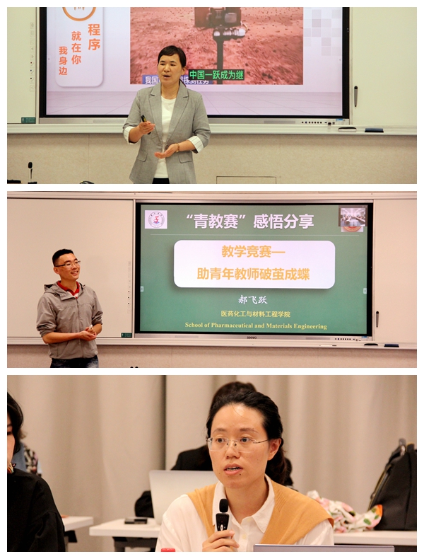 陈月芬老师为大家带来了一场精彩的课堂展示。在短短20分钟的时间里,她完整呈现了一节包含热点前沿的课堂导入、清晰有层次的课程目标、积极有效的课堂互动、安排合理的课后任务的优质课堂;郝飞跃老师以《教学竞赛——助青年教师破茧成蝶》为题,讲述了自己“教学小白——教学过关——教学比赛获奖——反哺课堂教学”的教师职业成长历程。参加青教赛带给他的不仅仅是教学技能的提升,更珍贵的是职业认同感和价值感的收获;杨晶金老师谈到,参加青教赛以及一系列的打磨交流活动,启发了她后续进行课程教学改革的灵感和激情。