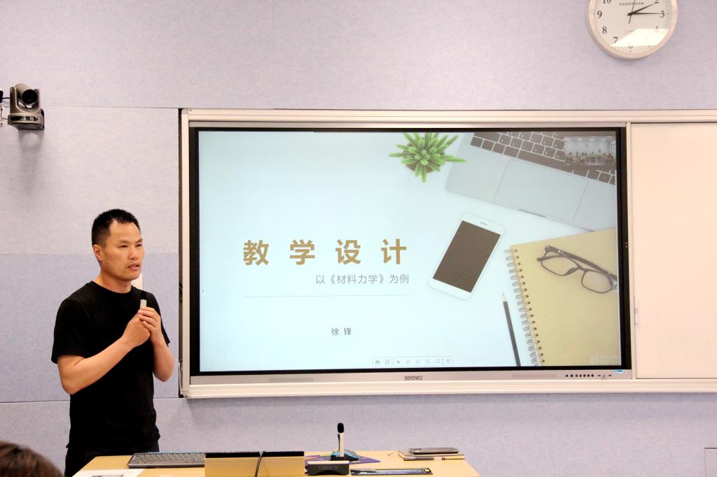徐锋首先从一流课程建设、教师教学竞赛等方面强调了教学设计的重要性。他认为“要始终瞄准课程教学目标的达成进行教学设计,围绕以学生为中心、关注学生学习产出的教学过程展开”,以《材料力学》的课程教学为例,徐老师向大家详细讲解了怎样进行教学设计,介绍并展示了BOPPPS教学设计方法及其在实际课堂教学中的应用。他鼓励在座新教师在教学设计中积极尝试应用现代信息教学工具,充分利用学校建设的各类智慧教室和信息化教学平台,让课堂教学活起来、教学效果实起来。徐老师还向大家全面细致地阐释了课程大纲、课程目标达成分析报告、教学设计样例等教学文件的撰写方法和注意要点。他强调,要通过教学设计把课程目标细化分解到每一节课,“让每节课像叶子一样,供养‘人才培养目标’这棵大树”。