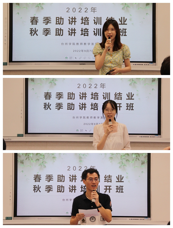 外国语学院吴婷婷、教师教育学院吴霓雯、智能制造学院林旺票作为优秀助讲教师代表上台发言。他们与大家分享了助讲培训期间的收获和感想,并对参加2022年秋季青年助讲培训的教师提出了一些学习建议。