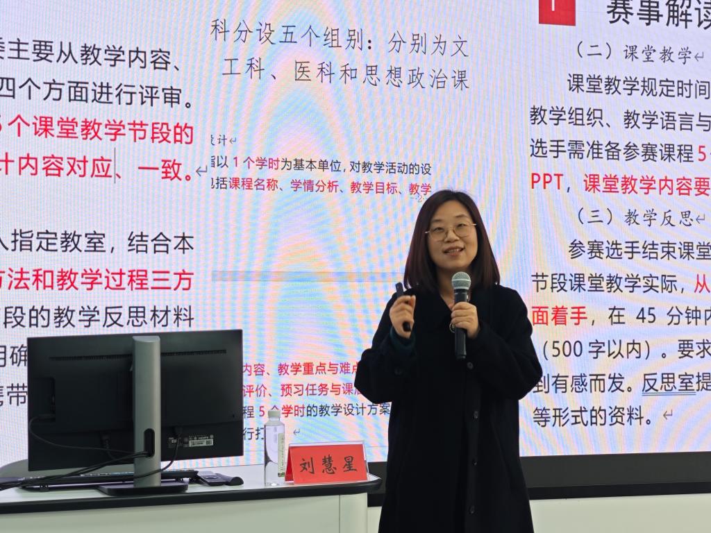 为推动教学创新,培养青年人才,进一步实现“以赛促教、以赛促改”。11月27日,教发中心开展青教赛经验分享交流会,邀请商学院刘彗星老师主讲。全体助讲教师参与本次培训。